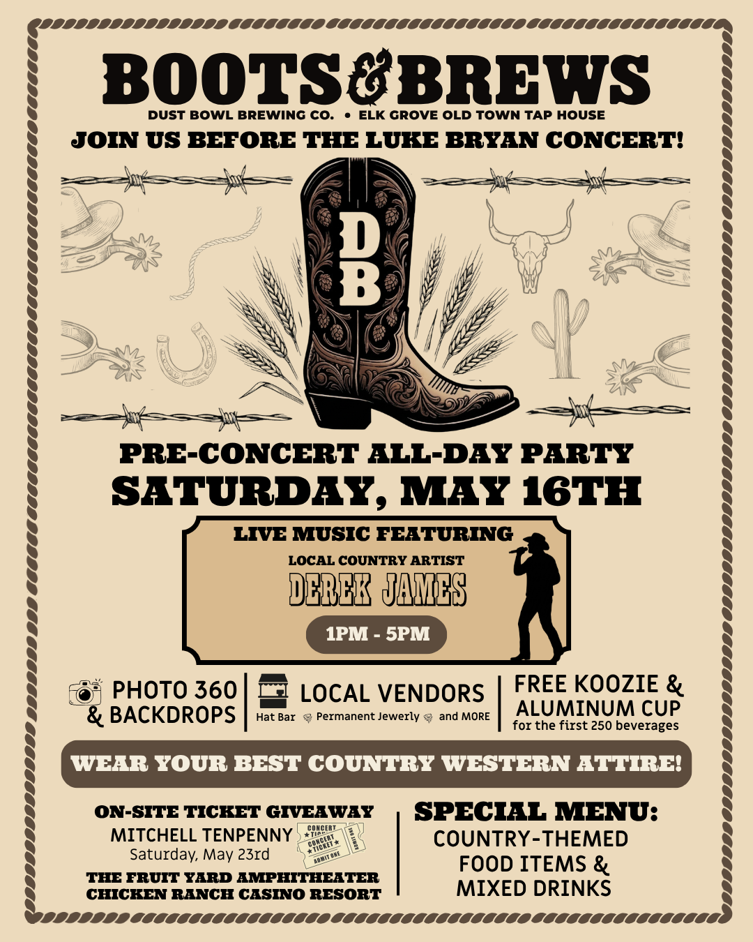 Live music from local country artist Derek James from 1-5pm. Ticket giveaway, Photo 360, hat bar, permanent jewelry, and more! Free koozie and aluminum cup for the first 250 beverages.