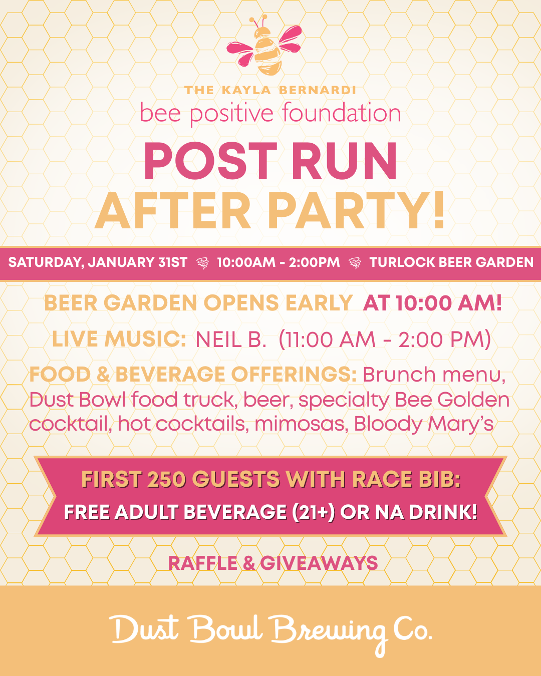Please join us in Dust Bowl’s Turlock Beer Garden on January 31st, 2026 from 10am-2pm for music, corn hole, and a BEE Positive Vibe.