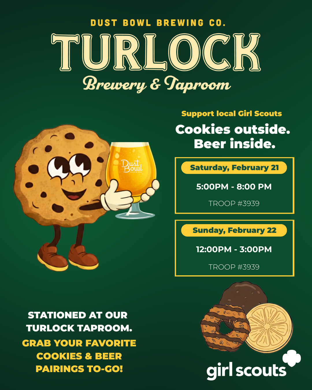 Come purchase your Girl Scout Cookies at Dust Bowl! 2/21 5pm-8pm and 2/22 12pm-3pm.